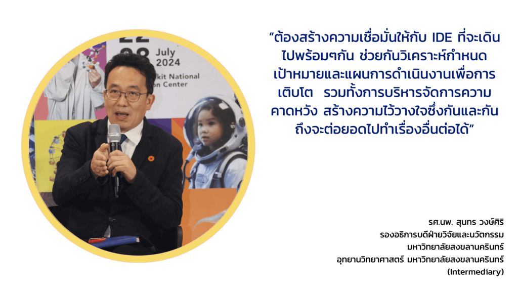 23 กรกฎาคม 2567 หน่วยบริหารและจัดการทุนด้านการเพิ่มความสามารถในการแข่งขันของประเทศ (บพข.) โดยแผนงานพัฒนาและส่งเสริมให้ประเทศเพิ่มธุรกิจฐานนวัตกรรม (Innovation driven enterprises: IDEs) (แผนงาน IDEs) ได้จัดงาน IDE DAY ซึ่งมีการเสวนา การแลกเปลี่ยนที่น่าสนใจ จากทั้งหน่วยงานตัวกลาง ผู้เชี่ยวชาญเฉพาะทาง และผู้ประกอบการ IDEs มาร่วมแลกเปลี่ยนมุมมอง เมื่อองค์กรถึงเวลาจะเติบโต ธุรกิจจะเดินไปอย่างไร การสนับสนุนของภาครัฐสำคัญอย่างไร ตลอดจนมีกิจกรรมสร้างเครือข่าย Networking ของหน่วยงานตัวกลาง ผู้เชี่ยวชาญเฉพาะทาง ตลอดจนผู้ประกอบการ IDEs ด้วย