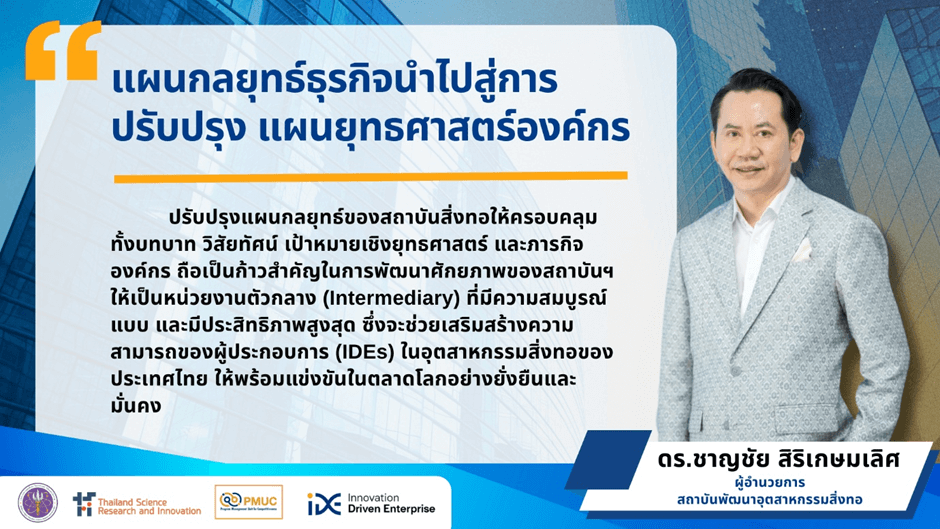 สถาบันพัฒนาอุตสาหกรรมสิ่งทอไม่ได้หยุดที่การพัฒนาเทคโนโลยีสิ่งทอ แต่เดินหน้าสู่การปรับยุทธศาสตร์ระดับองค์กร เพื่อขยายบทบาทของตนในฐานะ Intermediary ที่สามารถเร่งการเติบโตของธุรกิจ IDEs ได้อย่างมีพลังและยั่งยืน