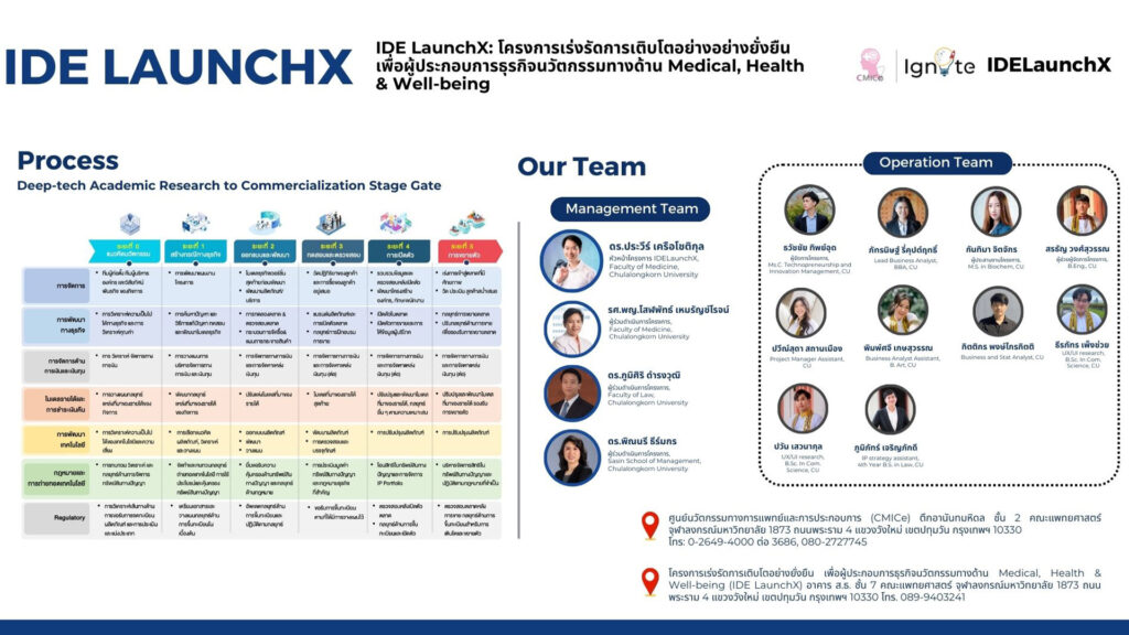 MICe IDE LaunchX : โครงการเร่งรัดการเติบโตอย่างยั่งยืน เพื่อผู้ประกอบการธุรกิจนวัตกรรมทางด้าน Medical, Health & Well-being ภายใต้ศูนย์นวัตกรรมทางการแพทย์และการประกอบการ (CIMCe) คณะแพทยศาสตร์จุฬาลงกรณ์มหาวิทยาลัย มีพันธกิจในการผลักดันงานวิจัยออกสู่เชิงพาณิชย์ และให้เกิดการประกอบการประสานงานเชื่อมโยงนวัตกรทางการแพทย์ ของคณะแพทยศาสตร์ กับผู้ประกอบการ รวมถึงออกแบบและค้นหาโมเดลธุรกิจที่มีศักยภาพช่วยเหลือและประสานงานในการนำเทคโนโลยีและนวัตกรรมออกสู่การใช้ประโยชน์เชิงพาณิชย์แบบครบวงจรทั้งในด้านเทคโนโลยี ธุรกิจ นวัตกรรม และกฎหมายที่เกี่ยวข้อง โดยในโครงการ CMICe IDE LaunchX