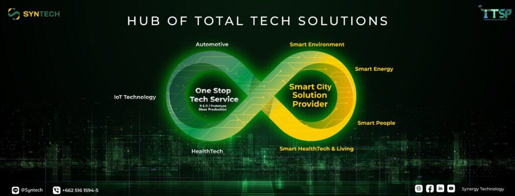 Syntech ยังคงพัฒนาและคิดค้นนวัตกรรมใหม่อย่างต่อเนื่อง เพื่อหาโซลูชั่นที่ลงตัวตอบโจทย์การใช้ชีวิตที่ดีขึ้นในยุคดิจิทัล ถือเป็นผู้นำธุรกิจด้านการพัฒนาและสร้างสรรค์ Smart Solution ด้วยเทคโนโลยีเฉพาะแบบครบวงจรให้กับหน่วยงานและองค์กรต่างๆ ธุรกิจมีการเติบโตอย่างต่อเนื่อง อีกทั้งเรามีทีมงานที่มีประสบการณ์หลากหลายและความเชี่ยวชาญด้านเทคโนโลยี พร้อมให้บริการทั้ง Solutions และ Services เพื่อตอบโจทย์การเป็น Tech Innovation Center For Sustainable แห่งแรกของจังหวัดปทุมธานี