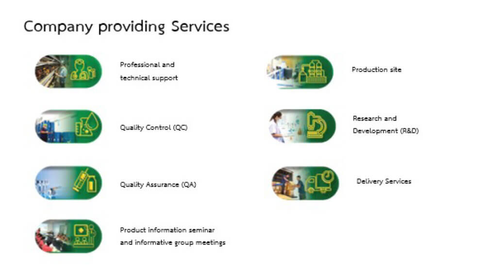 สายการผลิตมาตรฐานของบริษัทฯ ได้รับการรับรองมาตรฐานการผลิต GMP ในการผลิต ผลิตภัณฑ์ทำความสะอาดและฆ่าเชื้อ จากสำนักงานคณะกรรมการอาหารและยา ได้รับการรับรองอุตสาหกรรมสีเขียว ระดับ 3 จากกระทรวงอุตสาหกรรม และห้องปฏิบัติการทดสอบ (Lab) ได้รับรองความสามารถตามข้อกำหนด ISO/IEC 17025 : 2017 จากกรมวิทยาศาสตร์บริการ บริษัทฯ มีความต้องการค้นคว้า หาสารสกัดจากธรรมชาตินำมาพัฒนาผลิตภัณฑ์สารเสริมในอาหารสัตว์ เพื่อมาเสริมสร้างภูมิคุ้มกันโรค และทดแทนหรือลดการใช้ยาปฏิชีวนะในสัตว์เลี้ยงและสัตว์เศรษฐกิจ ซึ่งจะนำมาสู่คุณภาพชีวิตของสัตว์และจะส่งผลถึงการแปรรูปเนื้อสัตว์ที่มีคุณภาพ ลดสารตกค้างในเนื้อสัตว์ พัฒนาเป็นผลิตภัณฑ์ Organic ให้กับผู้บริโภค