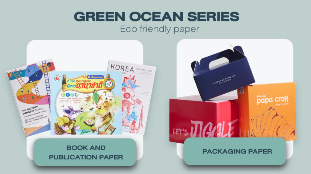 1. กระดาษรักษาสิ่งแวดล้อม Green Ocean ที่ผลิตด้วยกระบวนการผลิตจากโรงงานที่ได้รับการรับรองมาตรฐานการผลิตระดับนานาชาติและเป็นกระดาษที่ปล่อยก๊าซเรือนกระจกจากการผลิตน้อยที่สุดในโลก (เทียบจากตัวเลขของกระดาษในหมวดเดียวกันที่มีจำหน่ายในประเทศในขณะนี้)