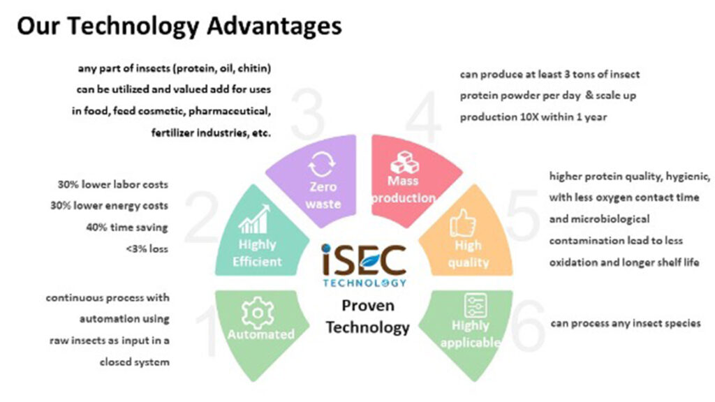 ภายใต้ I-Sec technology คือ กระบวนการผลิตผงโปรตีนที่ใช้เทคโนโลยีขั้นสูงพื่อการผลิตในระดับอุตสาหกรรม ด้วยระบบการผลิตแบบอัตโนมัติ จึงเป็นกระบวนการทีมีความใหม่และเป็นที่แรกของโลกในการผลิตผงโปรตีนจากจิ้งหรีด เพื่อตอบสนองความต้องการแหล่งโปรตีนสะอาดและคุณภาพสูง ในราคาที่เหมาะสมกับสภาวะตลาดของผู้ประกอบการและผู้บริโภคทั้งในประเทศและต่างประเทศ