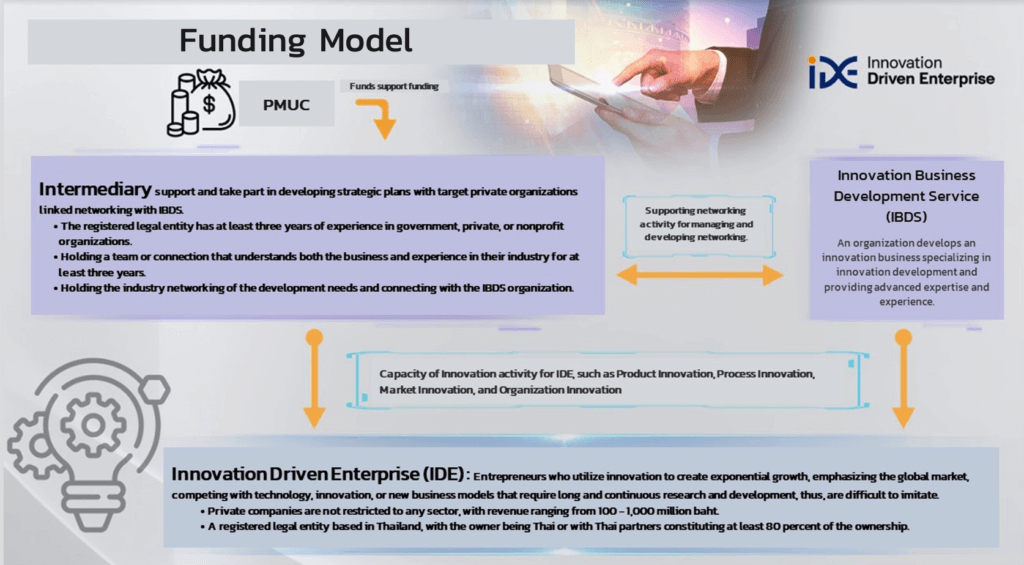 Program Management Unit for Competitiveness (PMUC) provides funding through selected intermediaries who propose an actionable strategy and a clear detailed plan for scaling-up and enhancing innovation capability of IDE candidates, including strategic plan, product innovation, process innovation, market innovation, and organization innovation. Intermediaries connect IDE candidates to proper Innovation Business Development Services (IBDS), key stakeholder, and other funding opportunities. This model will establish professional innovation and business intermediaries in Thailand, as well as improve the quality, raise the potential, and increase the number of IDEs.